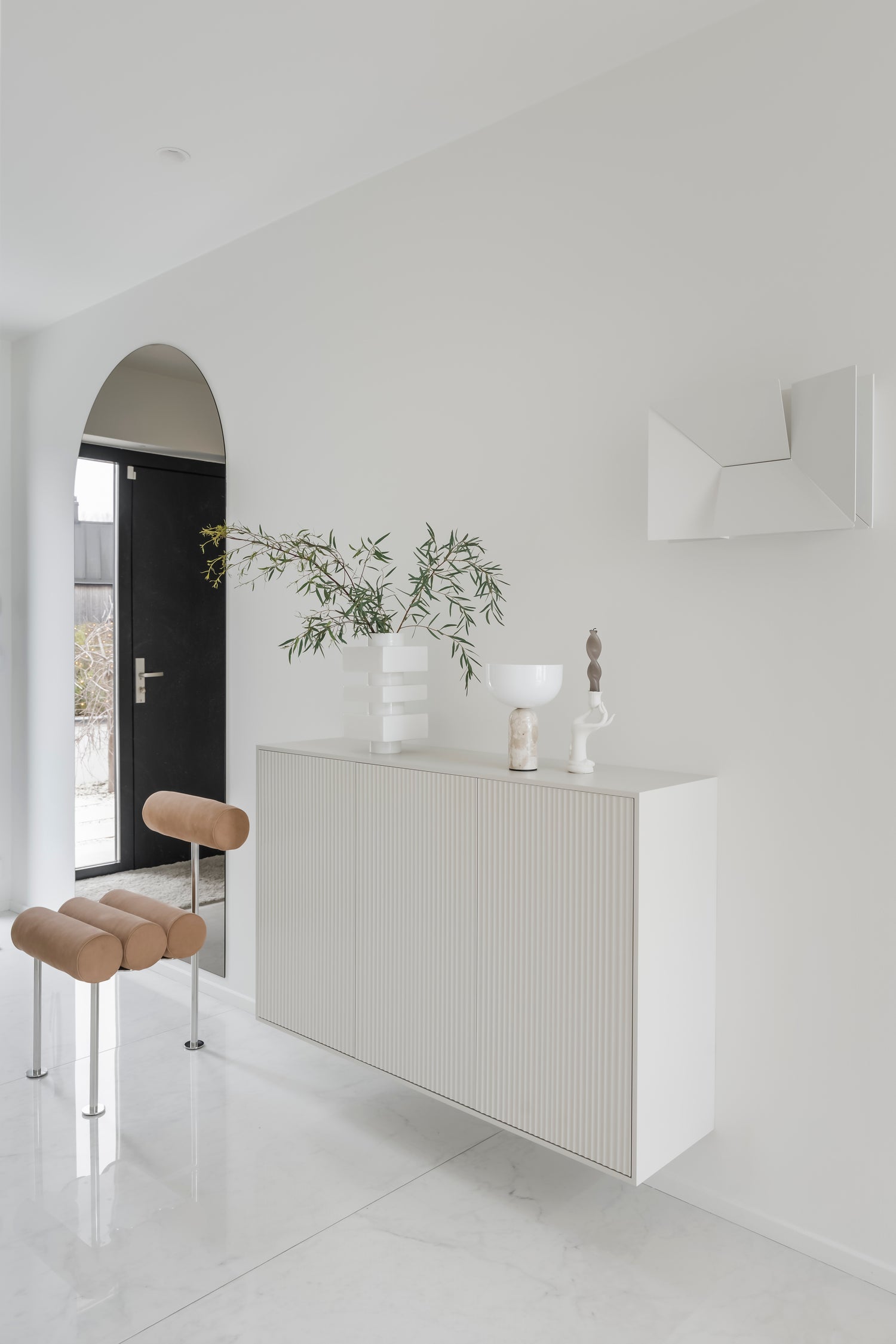 Modellen finns i tre olika storlekar och levereras med en push-open-funktion. Finns som vägghängd eller ståendes på sockel.