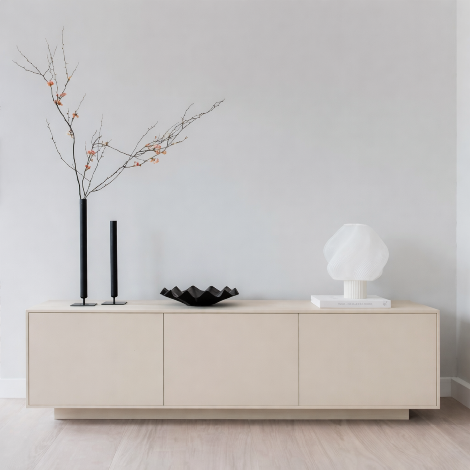 Alla våra mediabänkar har en smart distans mellan vägg och bakstycke. Det gör att du kan placera möbeln tätt intill väggen, samtidigt som vägguttag och kablar ryms mellan väggen och skåpet för ett rent och snyggt uttryck.