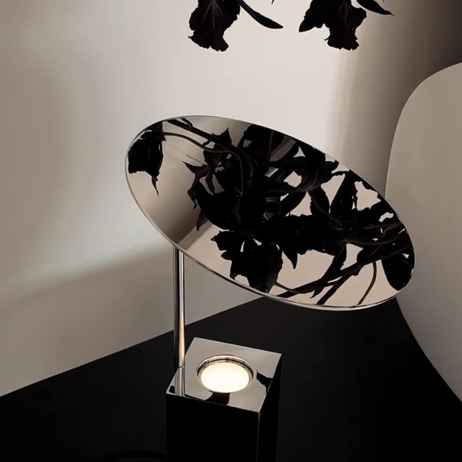 Ovanför sockeln sitter ett lock i vitt opalglas som mjukt diffuserar ljuset och leder det mot en cirkelformad metallreflektor, placerad på ett smäckert metallrör.